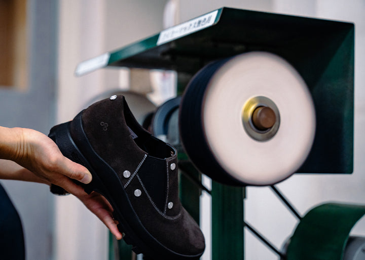 レザー製造時に限りなく水と化学物質の使用を最小化した独自のサスティナブルレザーを使用。